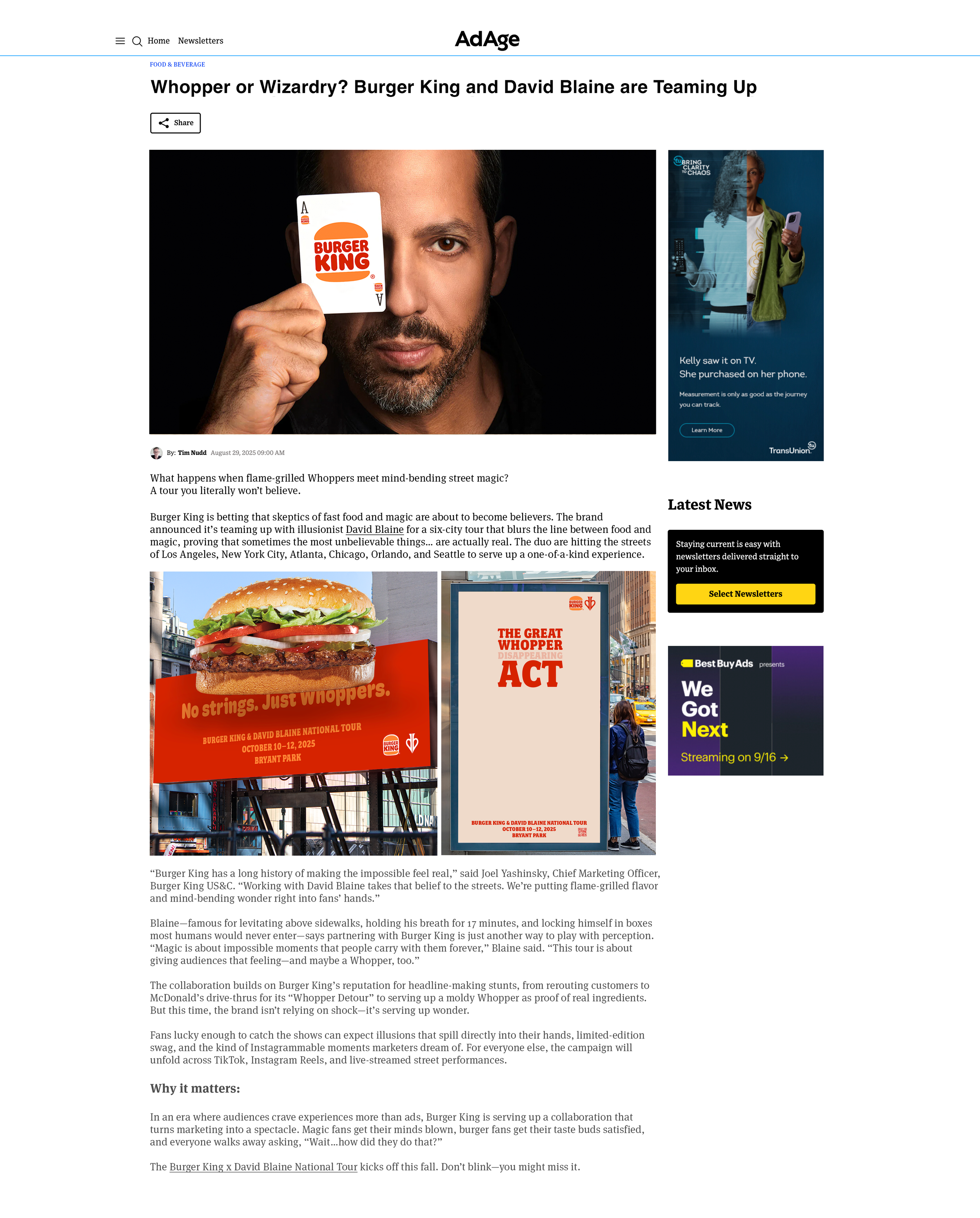 Burger King® is bringing a new kind of magic to streets with a national tour in partnership with world-renowned magician, David Blaine. The experience will travel through six cities, Los Angeles, New York City, Atlanta, Chicago, Orlando and Seattle, delivering an unforgettable mix of illusion, flame-grilled flavor, and authenticity.