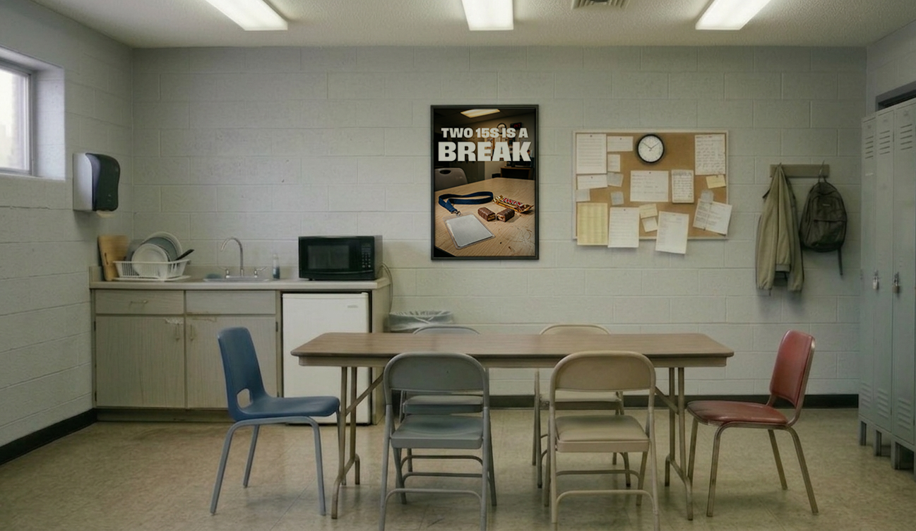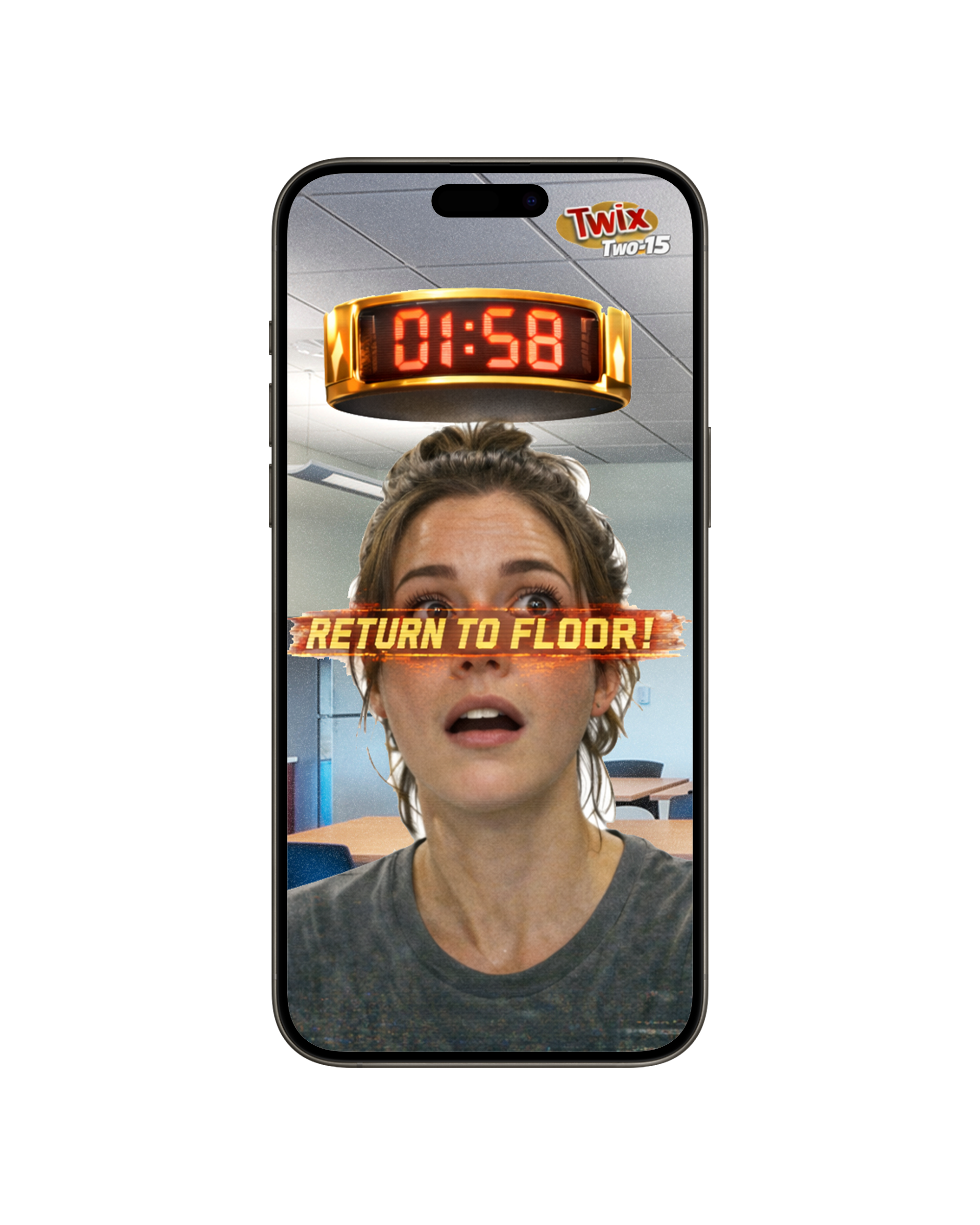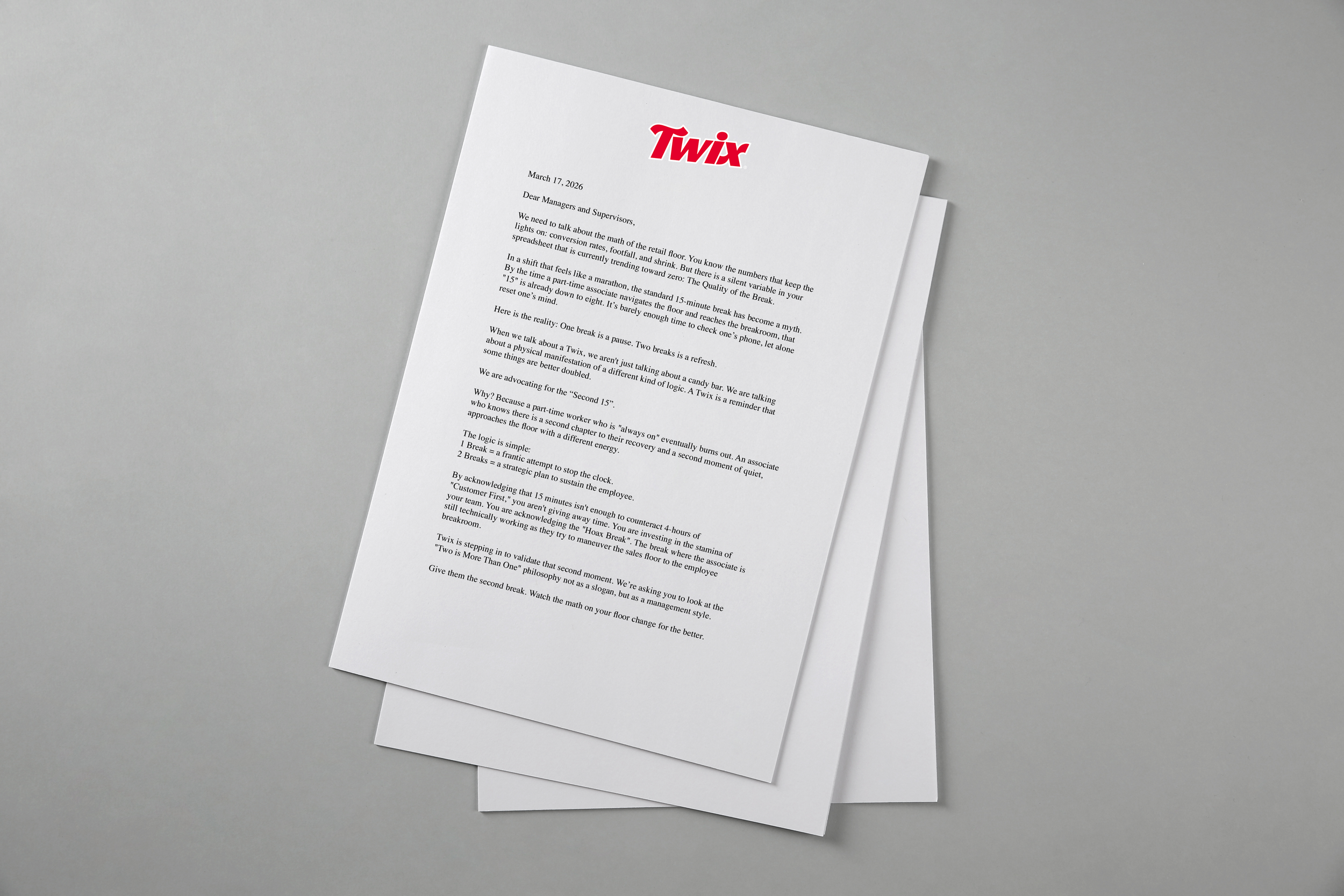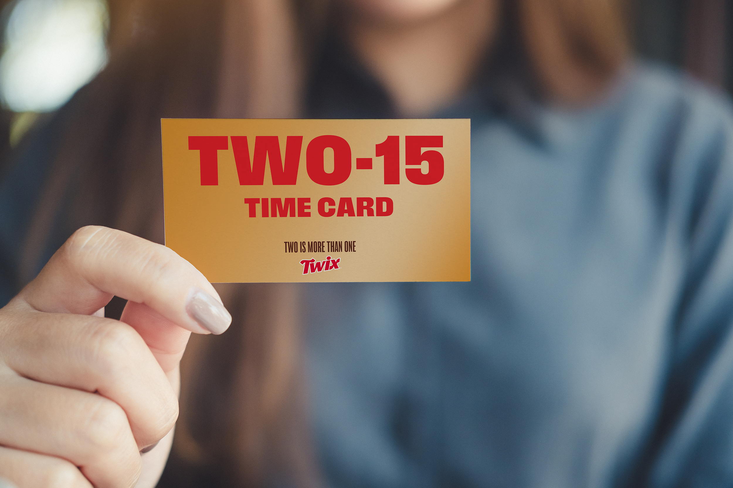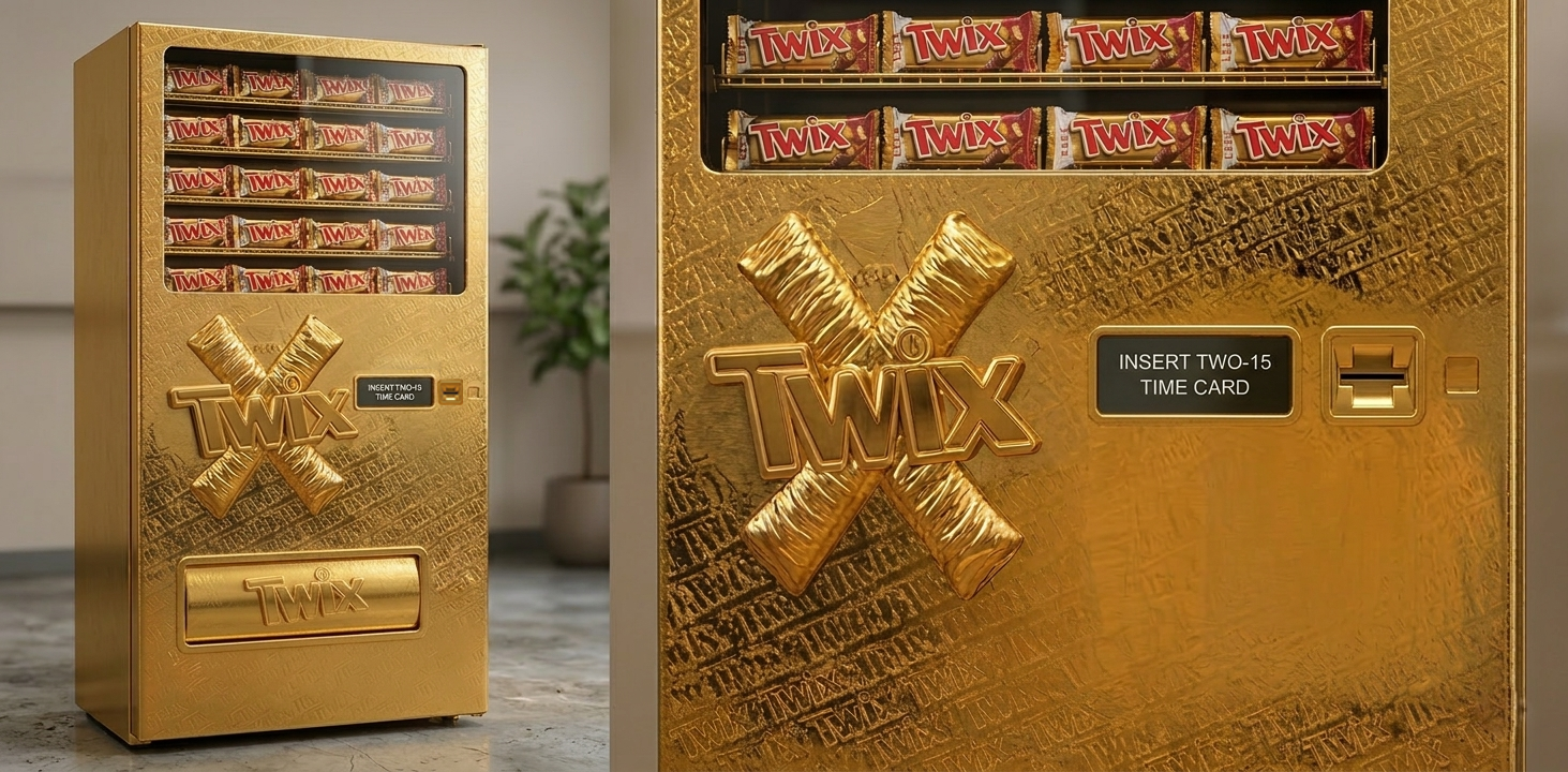 We created a specialized employee credential that, when inserted into the golden Twix vending machine, it unlocks an automated 15-minute extension to the employee’s original 15-minute break and dispenses a complimentary Twix bar to facilitate the extra downtime.